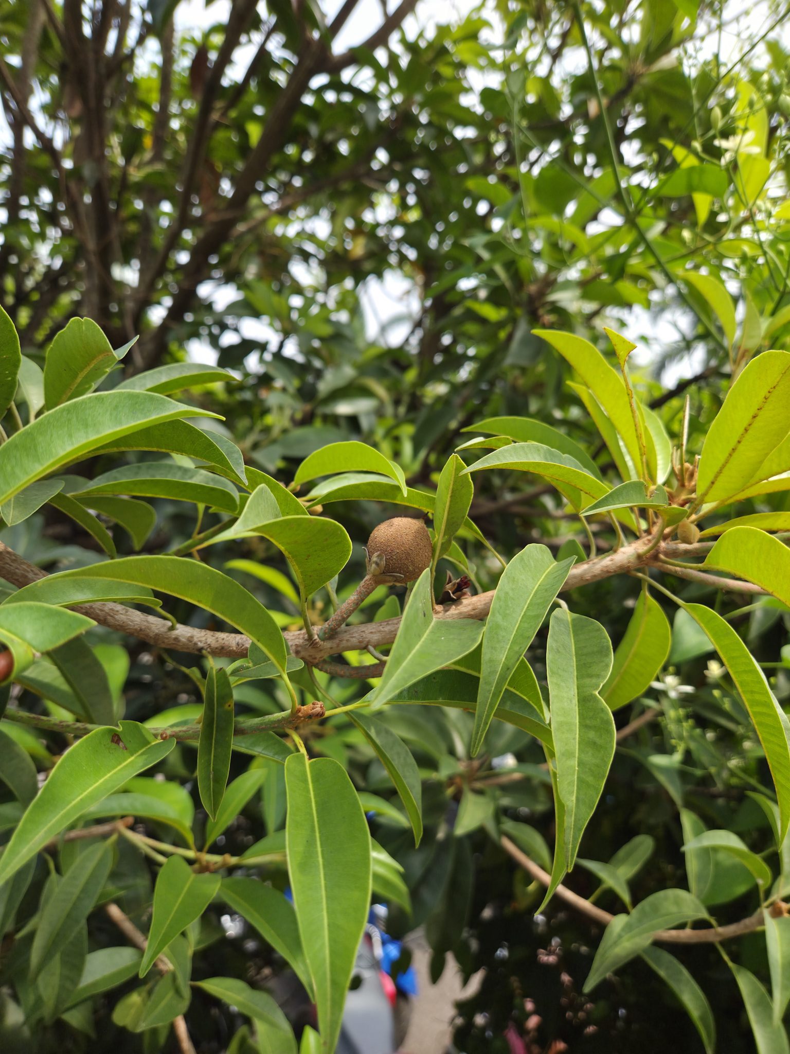 Alternative Text: A close-up view of a branch from a tree, featuring numerous glossy green leaves that are broad and elongated. Among the leaves, there is a small, Chiku fruit that has a brown, textured surface.
