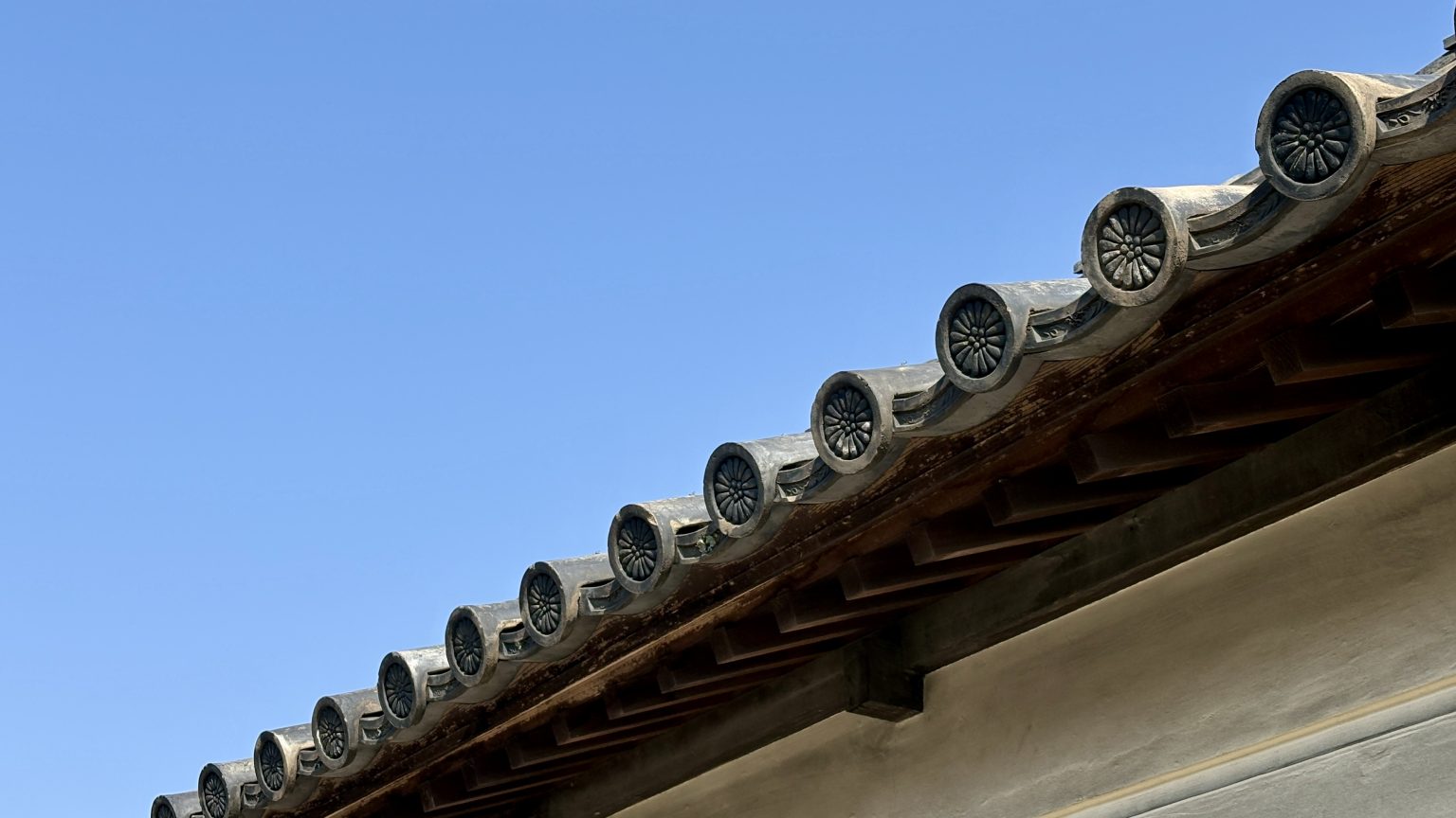 Alternative Text: Close-up of a traditional Japanese roof in Kurashiki, showing layered ceramic kawara tiles and decorative round end caps under a clear blue sky.