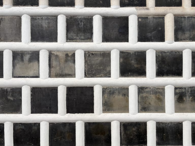 Alternative Text: Traditional Japanese “namako” wall with raised white plaster joints and dark tiles forming a clean geometric grid.