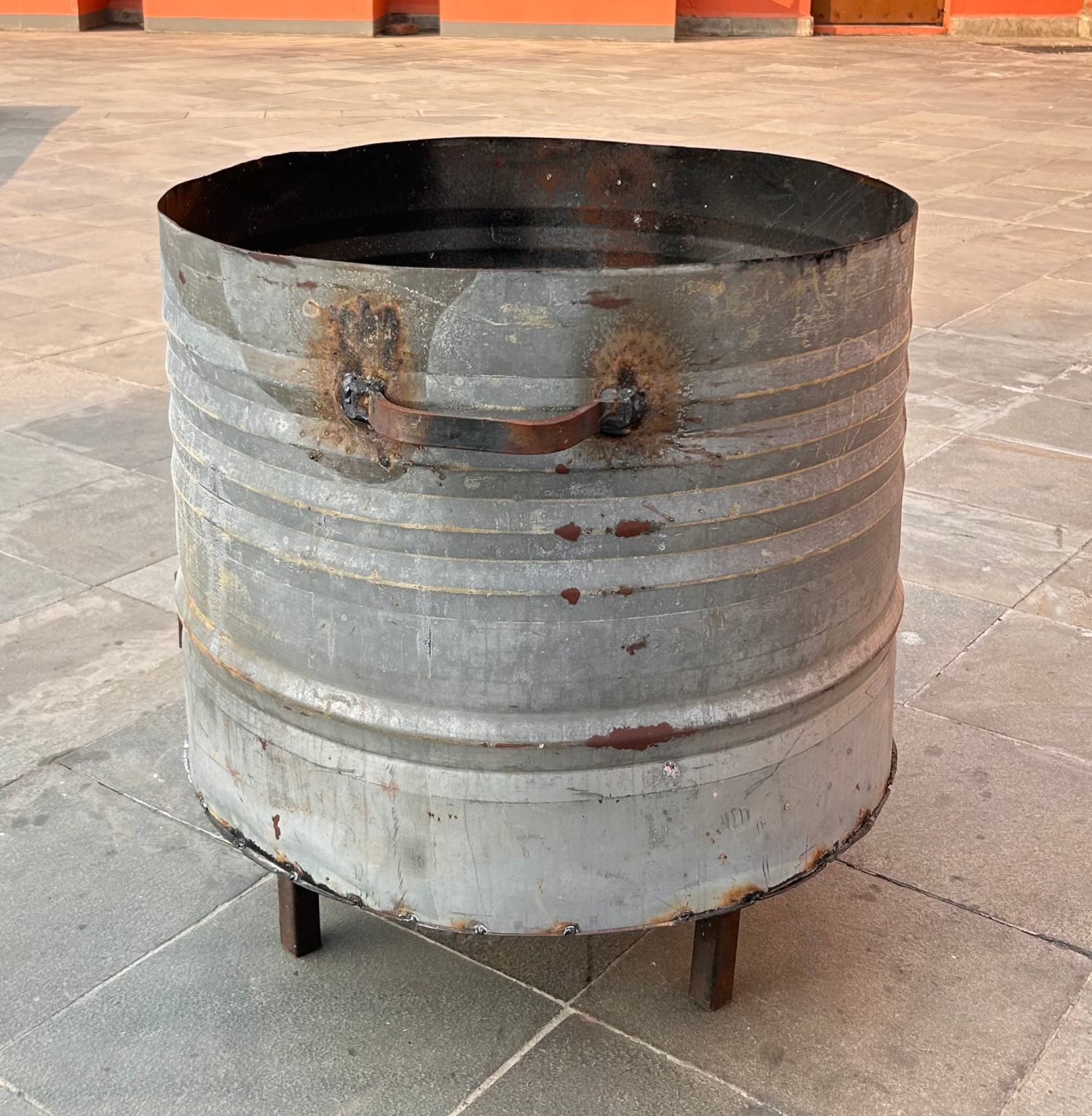Alternative Text: A large, round metal barrel with a slightly rusted surface, open rim, side handle, and four small legs, set on a stone floor.