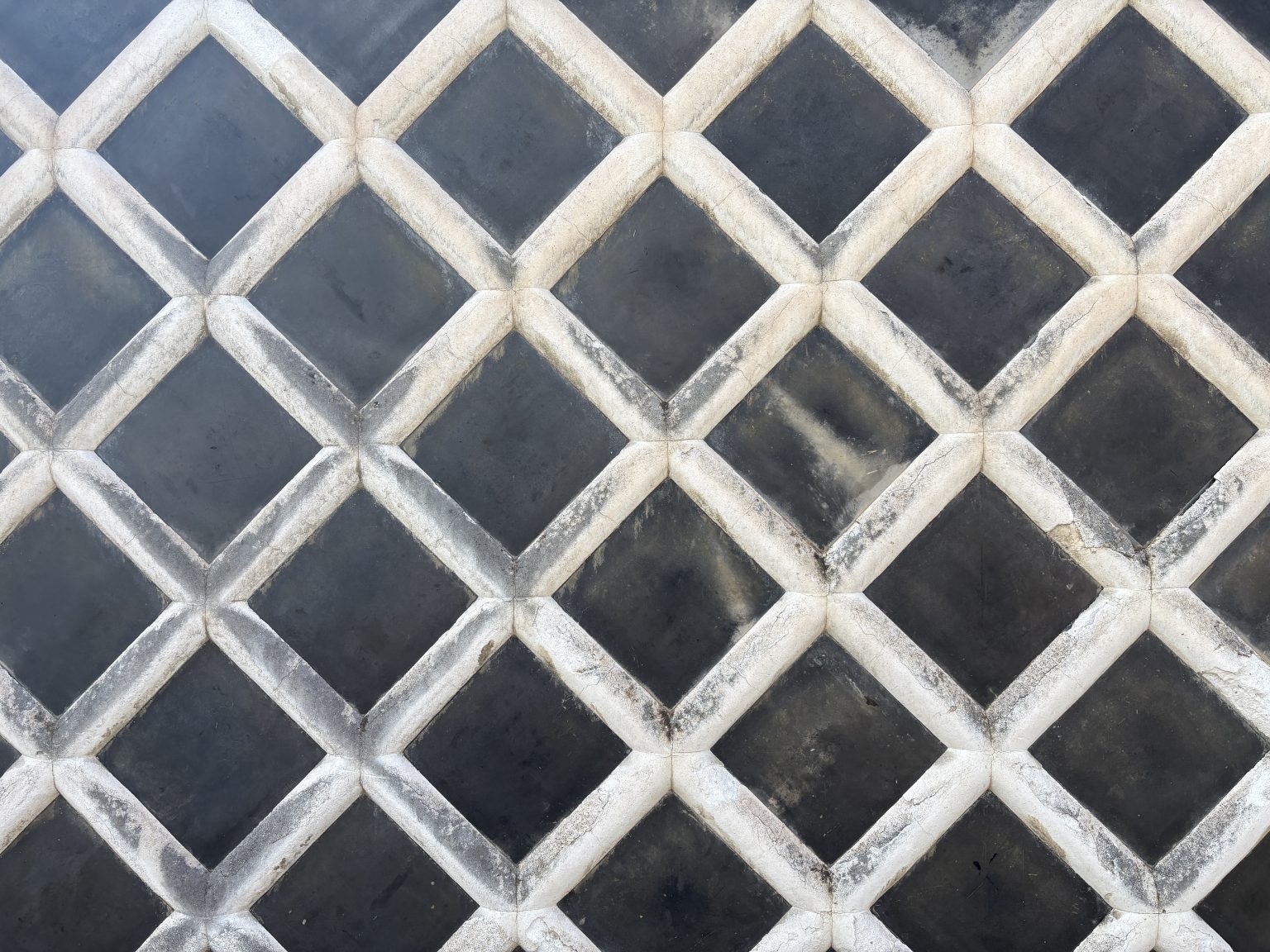 Alternative Text: Traditional Japanese “namako” wall featuring raised white plaster lines and dark tiles forming a geometric diamond pattern.