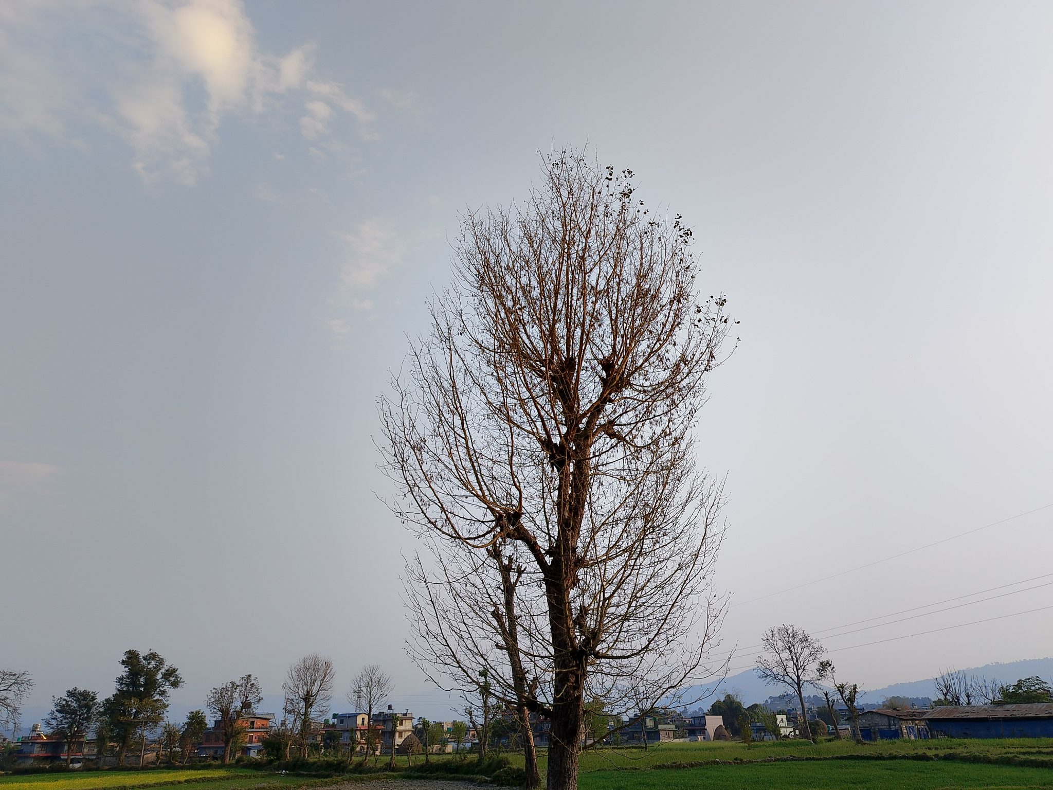 Alternative Text: A tall, bare tree stands prominently in an open field, its branches stretching out without leaves. The tree is surrounded by shorter trees in the background. There’s a horizon line of distant hills, while a few scattered houses are visible nearby. The sky above is mostly clear, with a few wispy clouds, creating a calm atmosphere. The landscape is t